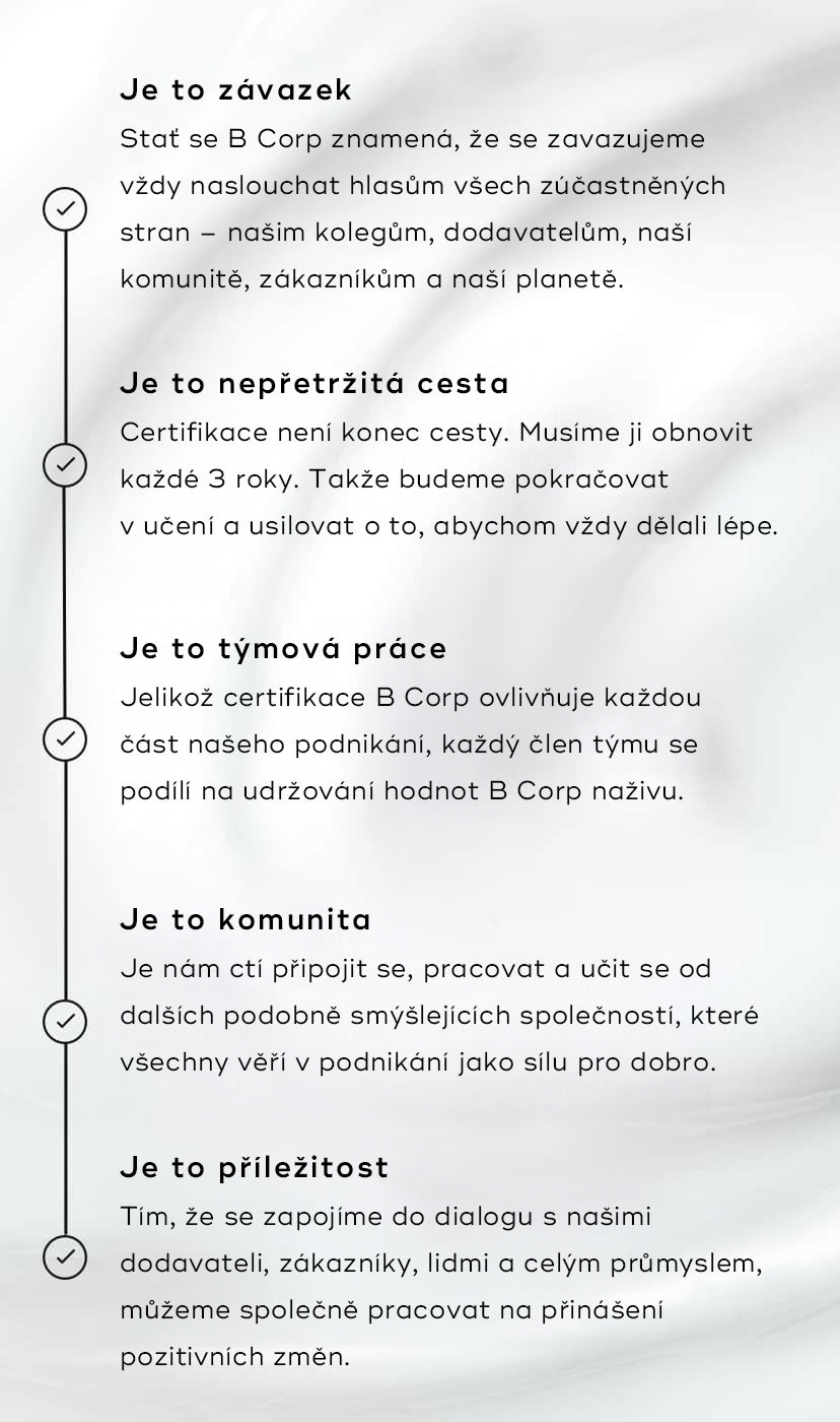 Společnosti s certifikací B Corporation™ (B Corps) jsou ověřeny nezávislou organizací B Lab™ a splňují přísné standardy v oblasti společenské a ekologické odpovědnosti, transparentnosti a odpovědného řízení.