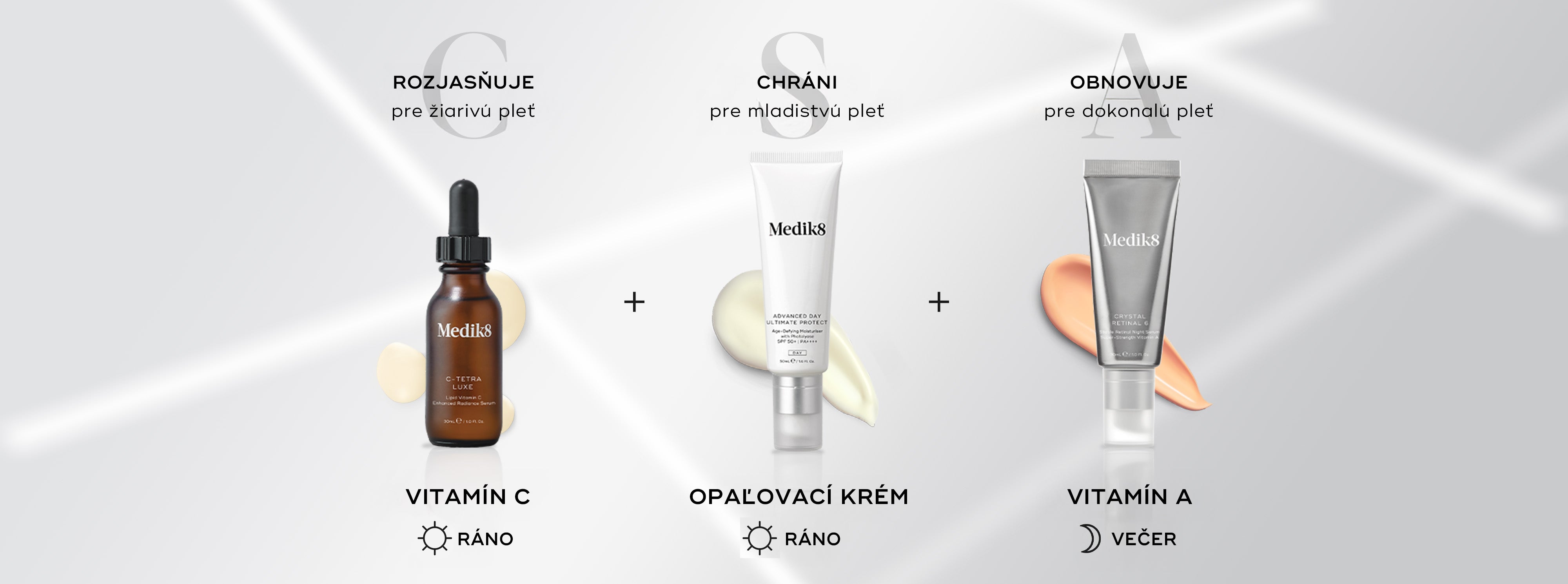 Zvyšte a udržujte viditelné omlazující účinky vitamínu C kombinací s opalovacím krémem a vitamínem A – podle průkopnické CSA filozofieⓇ od Medik8, která doporučuje vitamín C a opalovací krém během dne, vitamín A na noc. Dodržujte tento jednoduchý, klinicky ověřený přístup pro zářivou a mladistvě vypadající pleť.