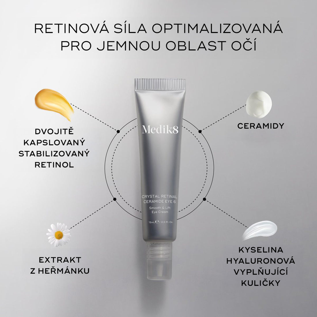 Představujeme Crystal Retinal Ceramide Eye – první klinicky silný retinal na světě určený přímo pro oblast pod očima. Nabízí několik optimalizací, které zaručují, že síla retinalu je využita naplno a zároveň šetrně k citlivé pokožce očí.