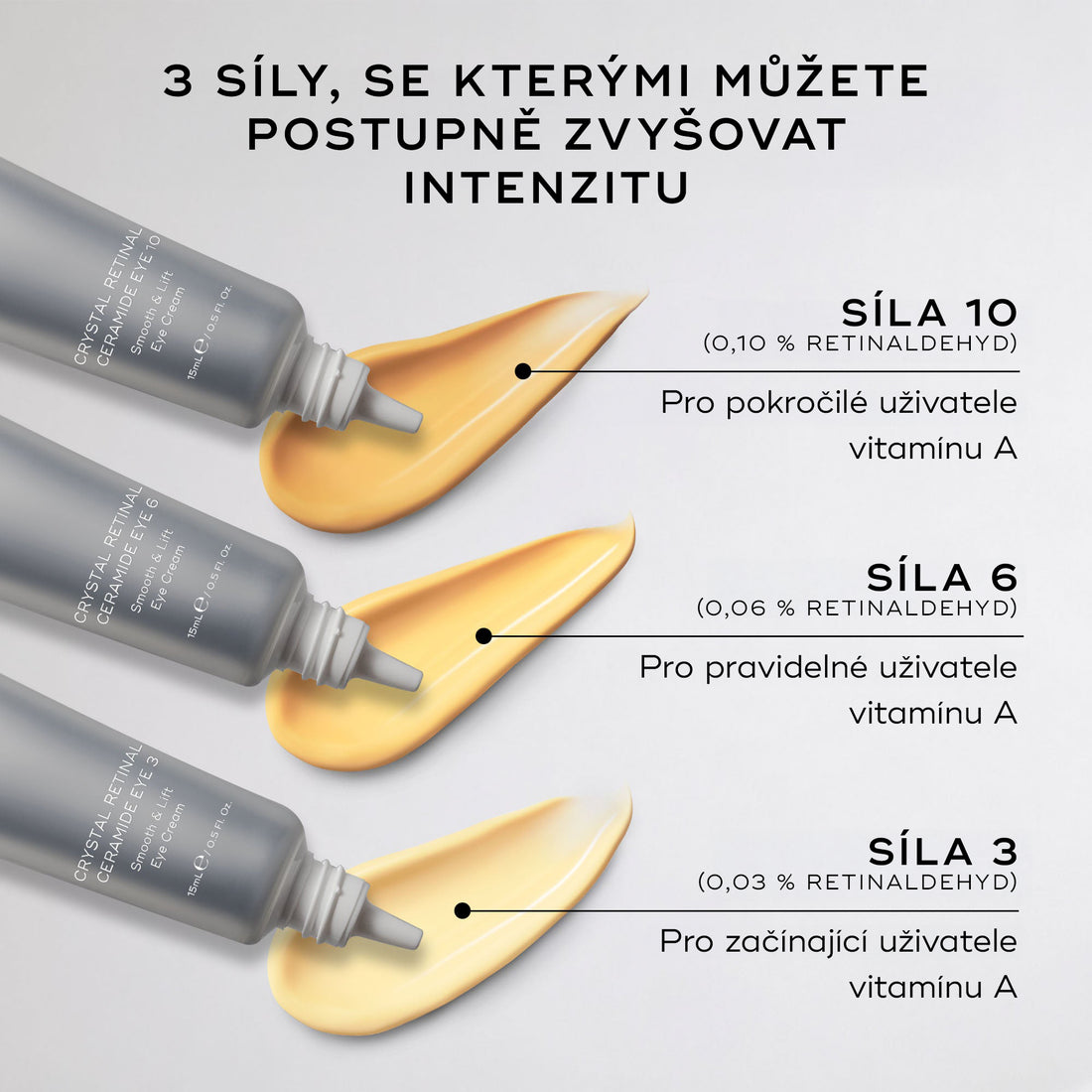Najděte si svůj ideální stupeň. Crystal Retinal Ceramide Eye je k dispozici ve 3 postupně sílících koncentracích retinalu (0,03 % – 0,1 %), abyste mohli své výsledky posouvat dál, až budete připraveni. Nejnižší koncentrace (stupeň 3) je určena pro velmi citlivou pleť nebo pro ty, kteří s vitamínem A teprve začínají. Vyšší stupně pak umožňují zkušenějším uživatelům postupně zesilovat účinek. S Crystal Retinal Ceramide Eye přichází do péče o oční okolí revoluční přístup s progresivní sílou retinalu. Výsledky tak budou s každým krokem silnější a nikdy neustrnou.