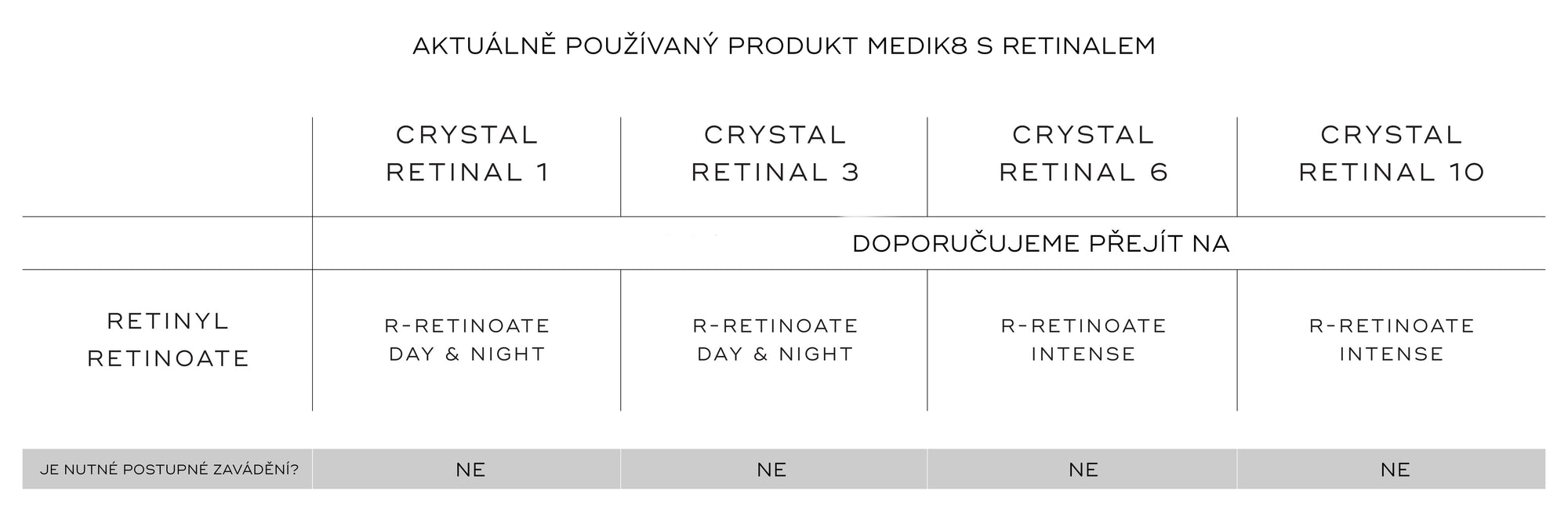 Poznámka: Při přechodu z Crystal Retinal na řadu r-Retinoate není nutné nové produkty do péče zařazovat postupně.